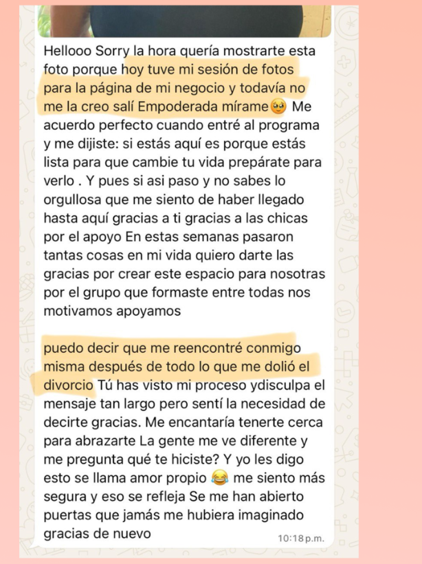 Grupo exclusivo en WhatsApp: Comparte avances, recibe motivación diaria y siente el apoyo de una comunidad que está en el mismo camino que tú.